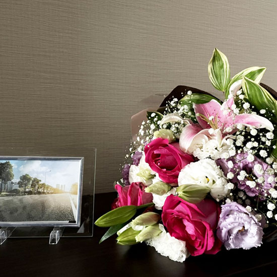 吹田市内・自社便配達地域の場合は、床置きアレンジメントや胡蝶蘭・スタンド花などの大型商品は、フラワーピース又は紅葉山会館のスタッフが配達でお届けいたします。